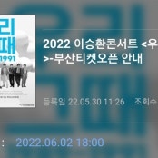 출처:인터파크티켓 2022 이승환콘서트 <우리 그때>-부산 1.공연정보 1) 공연일시 : 2022년 7월 23일 (토) 오후5시 2) 공연장소 : 부산시민회관 대극장 3) 티켓가격 : R석 143,000원, S석 121,000원 4) 관람등급 : 만7세 이상 관람가 (미취학아동 입장불가) 5) 러닝타임 : 약120분 (인터미션 없음) 2….